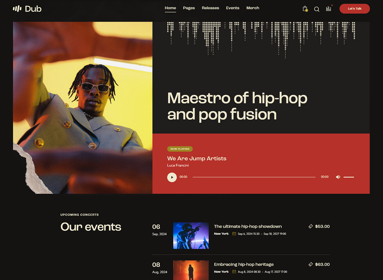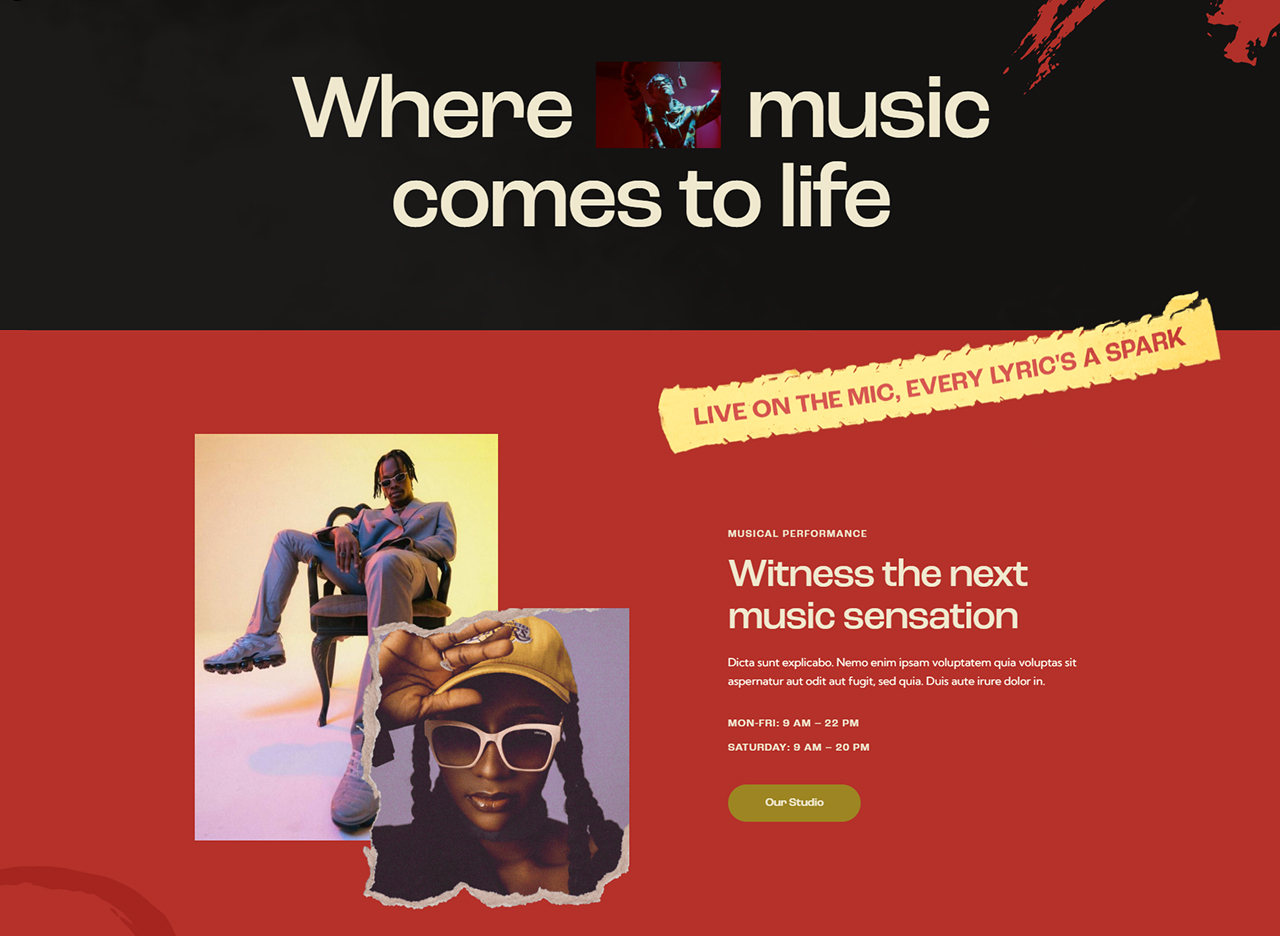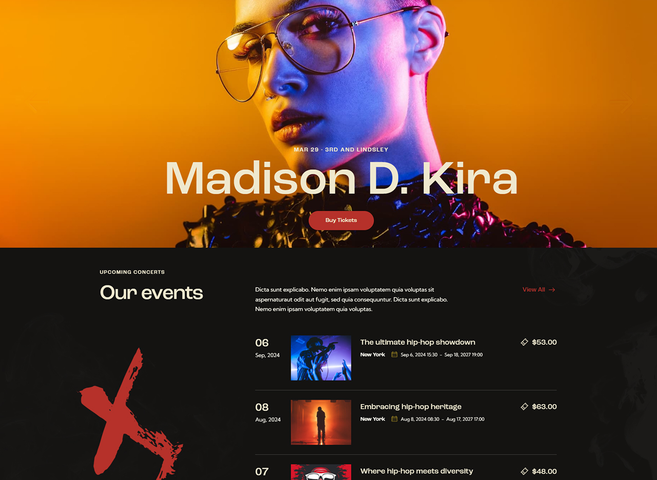 - Events & ticket sales: A dynamic homepage featuring upcoming gigs, countdowns, “Buy Tickets” calls-to-action, artist highlights.