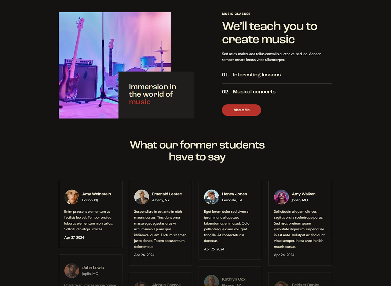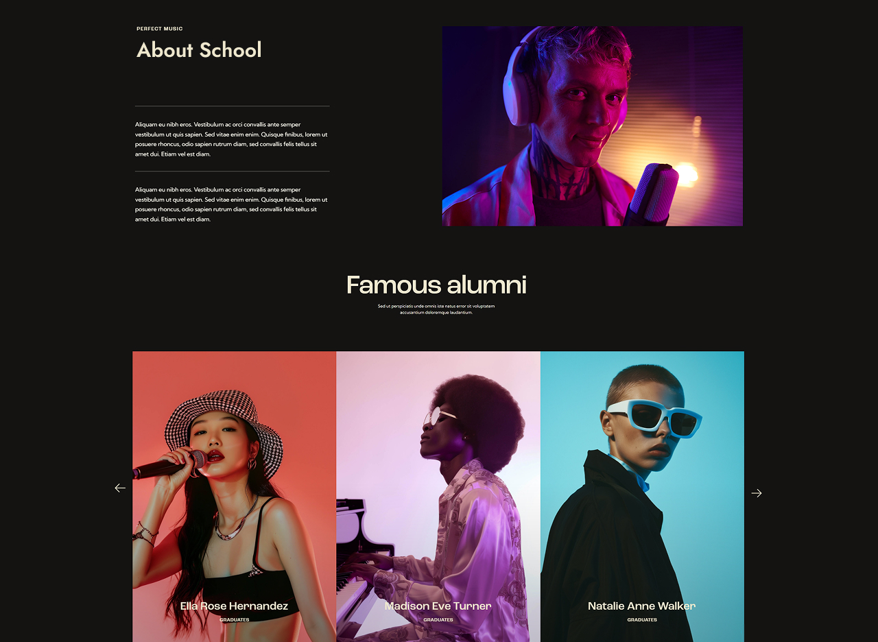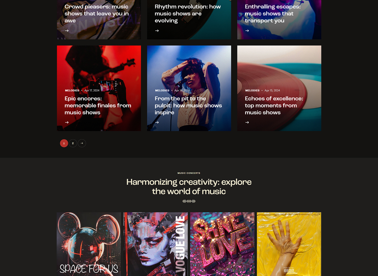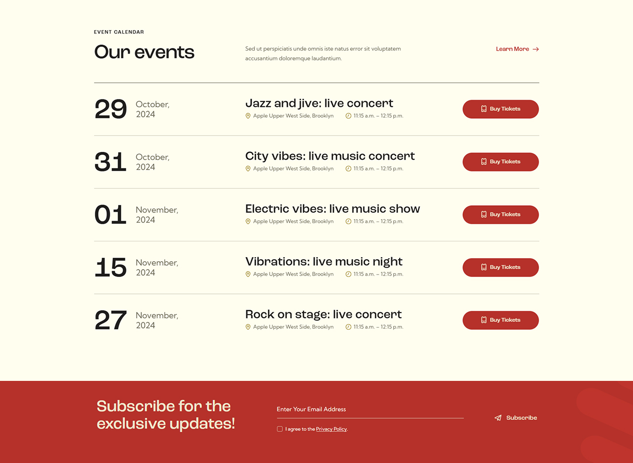 - Events & ticket sales: A dynamic homepage featuring upcoming gigs, countdowns, “Buy Tickets” calls-to-action, artist highlights.
